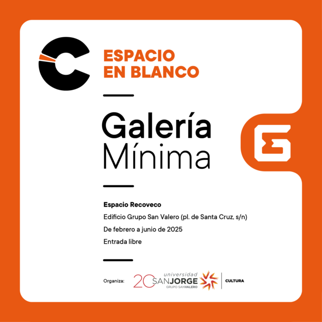 RECOVECO «Galería Mínima» Cultura y Ediciones de la Universidad San Jorge dentro de su programa expositivo Espacio en blanco Recoveco, y gracias a algunas de las galerías de arte de la ciudad de Zaragoza, presenta «Galería Mínima». Una programación expositiva en la que una vez al mes se presentará el trabajo de un artista aragonés…