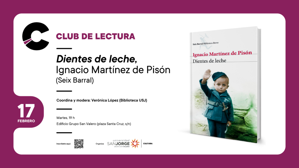 La segunda sesión del Club de Lectura 2026 se celebrará el 17 de febrero a las 19:00 h en el Edificio Grupo San Valero (plaza de Santa Cruz, s/n) y en ella charlaremos sobre Dientes de leche, de Ignacio Martínez de Pisón. La sesión estará moderada por Verónica López, responsable de Biblioteca USJ.