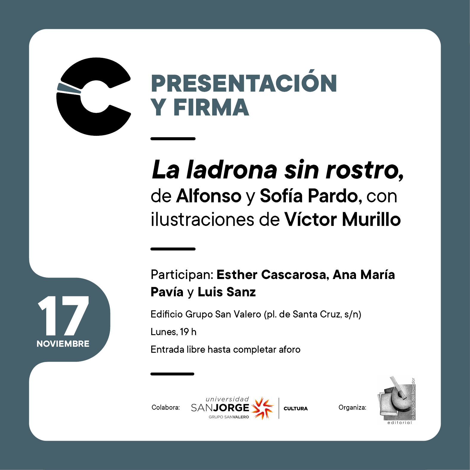 El lunes 17 de noviembre, la editorial La fragua del trovador, en colaboración con Cultura USJ, presenta el libro La ladrona sin rostro, de Alfonso y Sofía Pardo, e ilustrado por Víctor Murillo. Además, intervendrá Luis Sanz, editor de La fragua del trovador, y la actriz Ana María Pavía ofrecerá lecturas dramatizadas de algunos pasajes de la obra. La presentación, que tendrá lugar en el salón de actos del Edificio Grupo San Valero a las 19:00 h, correrá a cargo de Esther Cascarosa, profesora y directora del Departamento de Didácticas Específicas de la UZ.