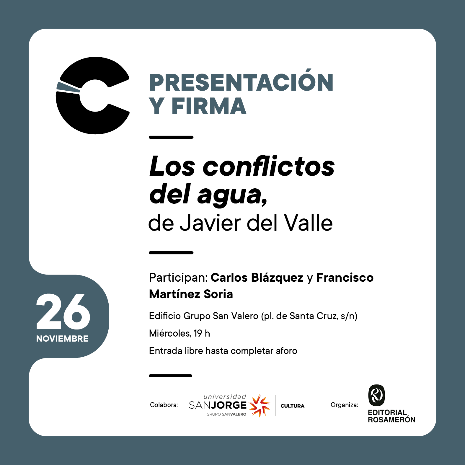 El miércoles 26 de noviembre, Editorial Rosamerón, en colaboración con Cultura USJ, presenta el libro Los conflictos del agua, de Javier del Valle. Durante la presentación, que tendrá lugar en la sala Ebro del Edificio Grupo San Valero a las 19:00 h, el autor conversará con Carlos Blázquez, historiador y especialista en patrimonio hidráulico e ingeniería del agua, y Francisco Martínez Soria, director de la editorial.