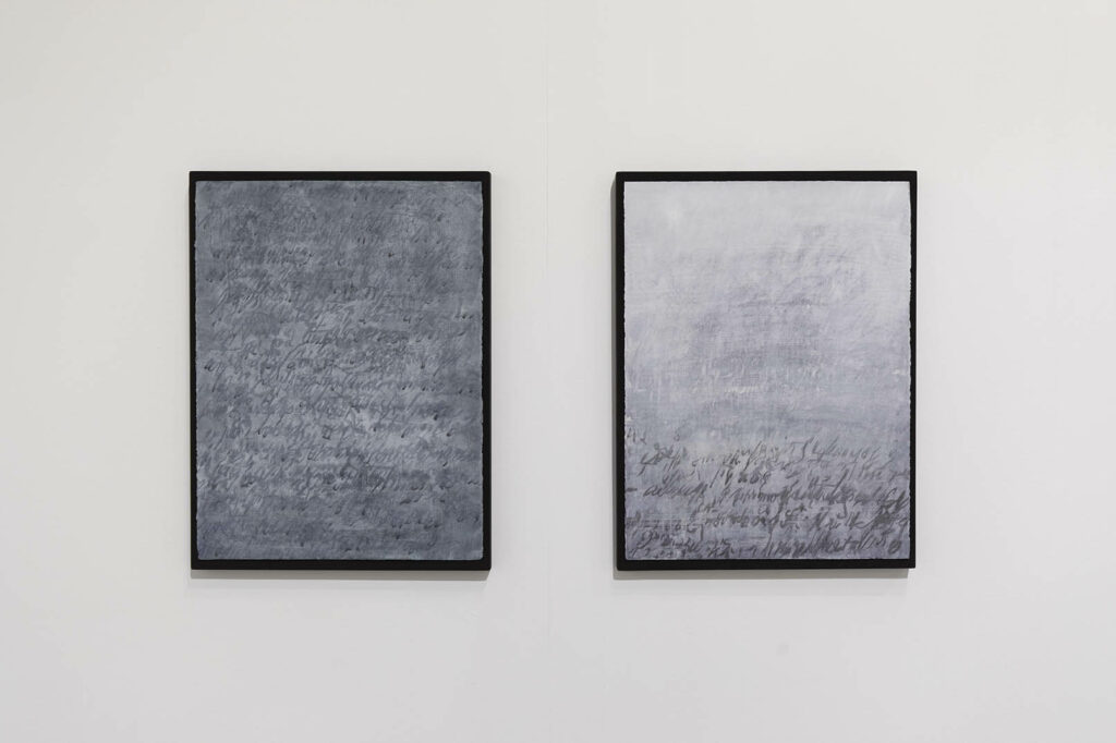 Sostiene Ramón Andrés que el silencio, la no presencia del lenguaje, deja la identidad en vilo. En la soledad de su taller, Holecz pinta la pérdida de identidad en la serie Mots d’exil mediante un proceso pictórico que convierte en imágenes el progresivo desgajamiento de una escritura suspendida, incapaz ya de custodiar la memoria. Sobre una capa de yeso blanca, delinea la grafía cambiante, distorsionada, vacilante, caótica, balbuceante y en declive de las cartas que Camille Claude envió desde el psiquiátrico. Nadie reconocía su voz y era complicado entender su escritura demente… Cómo escribir cuando el frío impide sostener la pluma; qué decir cuando la lengua está en retirada. Se negó a crear, dicen. Louisa Holecz protege en esta secuencia de pinturas la memoria de Camille Claudel, rescatándola del olvido; que no es sino la expresión de la necesidad de pertenencia con el ánimo de fortalecer la identidad poniéndola a salvo mediante imágenes.