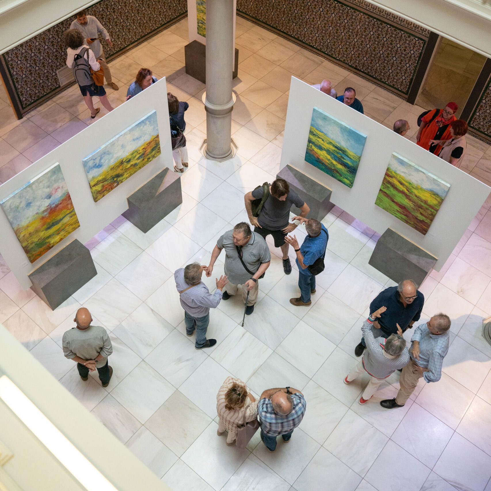 Con la exposición «Tierras de Aragón», Aguarón Ezpeleta nos invita a traspasar el límite de sus lienzos, como si abriera un mirador hacia una naturaleza en la que perderse y hacerlo sin brusquedad, dejándonos llevar por una marea de grandes trazos pardos, rojizos, azules, amarillos y verdes domesticados por un sol que blanquea un cielo luminoso, hasta perderse en esa luz intensa de las tierras del Aragón que tan bien conocemos.