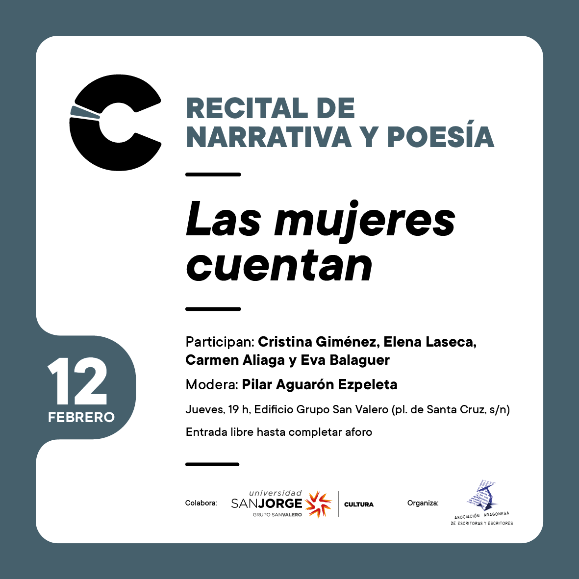 El jueves 12 de febrero, la Asociación Aragonesa de Escritoras y Escritores, en colaboración con Cultura USJ, organiza en la Sala Ebro del Edificio Grupo San Valero el Recital de narrativa y poesía Las mujeres cuentan. En este encuentro, presentado por Pilar Aguarón, cuatro mujeres de la escena literaria y cultural zaragozana seleccionarán y leerán relatos breves escritos por mujeres.