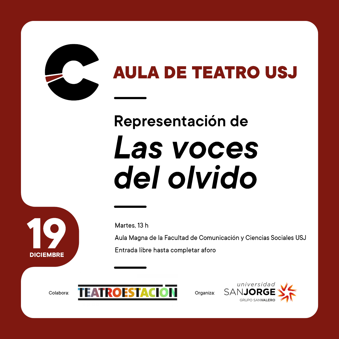 La Universidad San Jorge desde su programa Huella USJ y Cultura USJ, en colaboración con el Teatro de la Estación, te invita a acercarte al interesante mundo de las artes escénicas a través de la representación Las voces del olvido. Una muestra teatralizada por un elenco de estudiantes de la universidad que han participado en el Aula de Teatro USJ durante el primer cuatrimestre del curso 23/24.